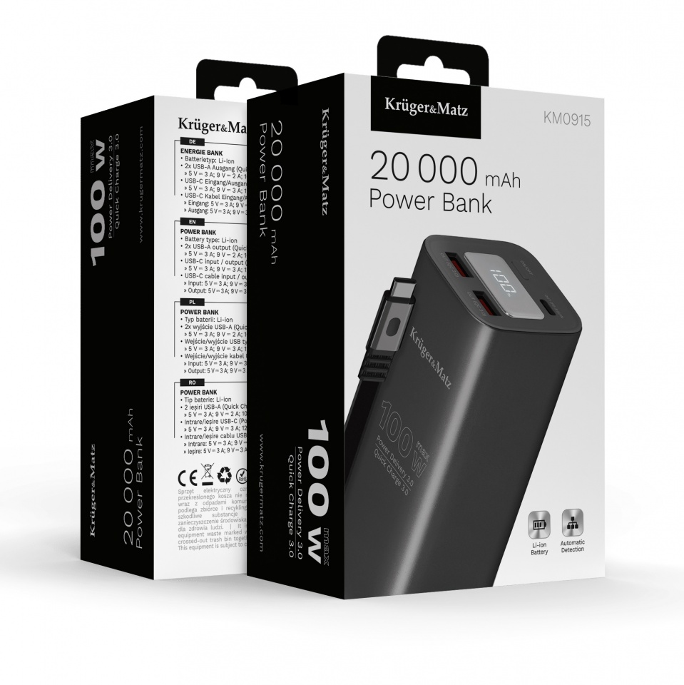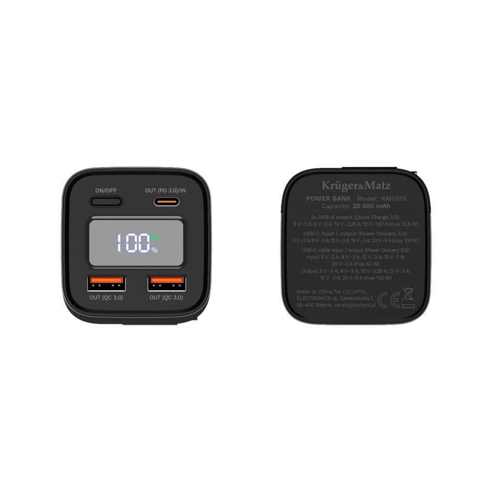 PowerBank; 20000mAh; 5V; 3A; 100W; 2x gniazdo USB; gniazdo USB C; gniazdo microUSB; QC; KM0915; Krüger&Matz