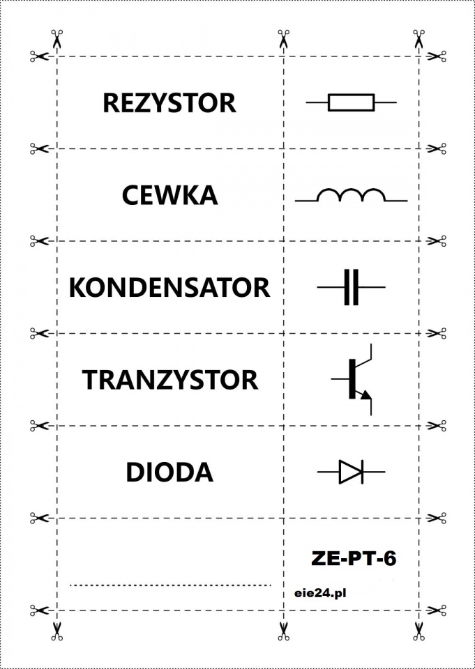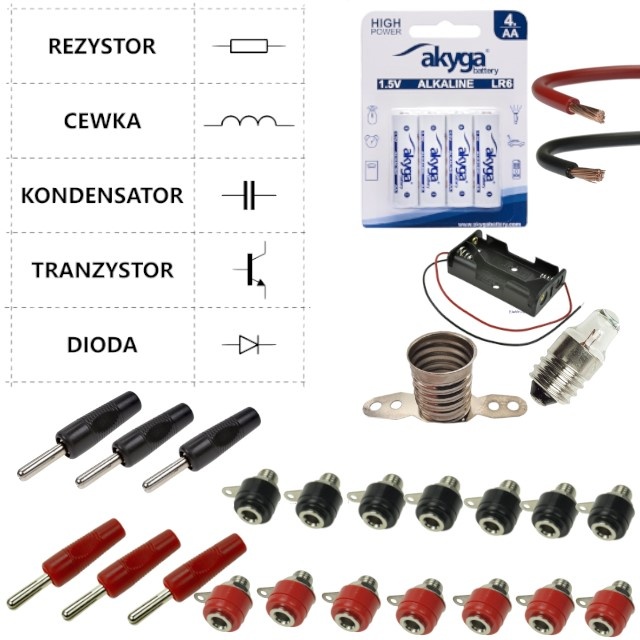 Zestaw pozwala na samodzielne zbudowanie modelu edukacyjnego w formie interaktywnej gry. Zadanie polega na połączeniu nazw elementów elektronicznych (rezystor, dioda, kondensator) z ich oficjalnymi symbolami graficznymi.