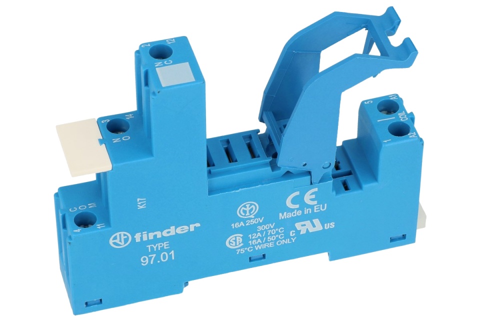 Gniazdo przekaźnika; F97.01.SPA; na szynę DIN35; śrubowy na panel; niebieski; z obejmą; kompatybilne z przekaźnikami: serii: 46.61 Finder; RoHS;