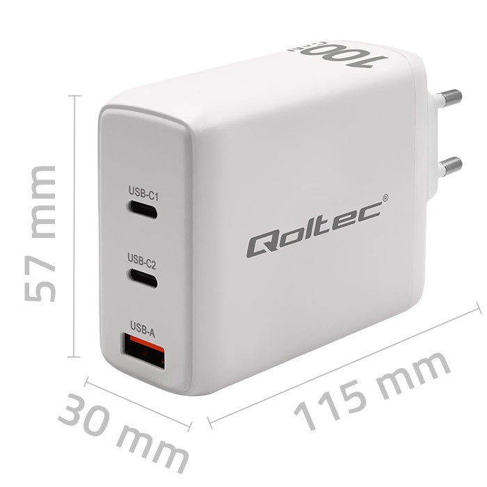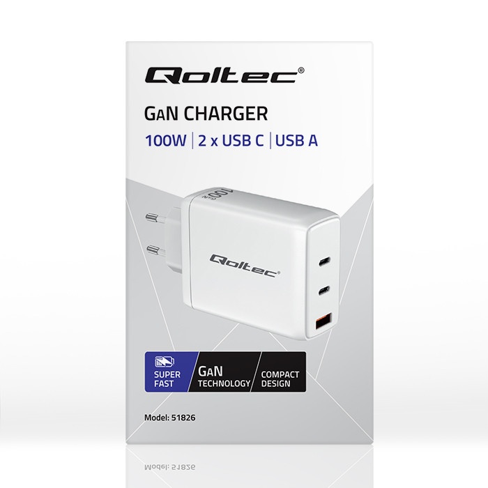 Ładowarka sieciowa; gniazda USB; 2x gniazdo USB C PD; 5-20V; 100W; 1,5-5A; Quick Charge 3.0; zastosowanie: laptop; smartfon; 51826; Qoltec; RoHS