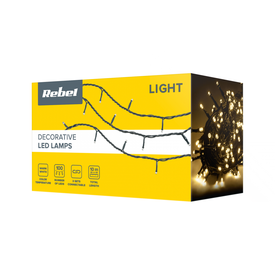 Lampki choinkowe; zewnętrzne; 100 LED; dł.10m, biały ciepły ze zmianą trybu świecenia; 31V; 3,6W; 116mA; IP44; ZAR0479-1; REBEL; RoHS