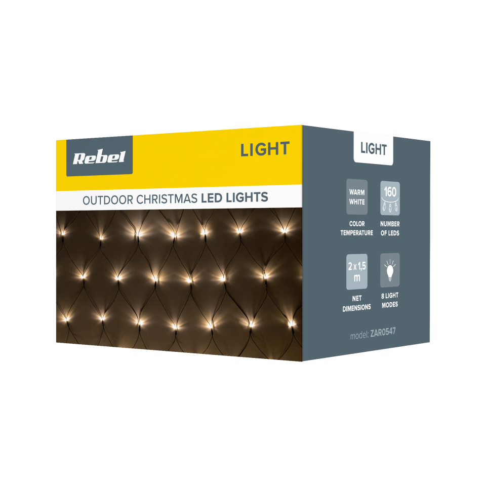 Lampki choinkowe; zewnętrzne; 160 LED; 2x 1,5m, biały ciepły ze zmianą trybu świecenia; 31V; 6W; IP44; Kurtyna świetlna; ZAR0547; REBEL; RoHS