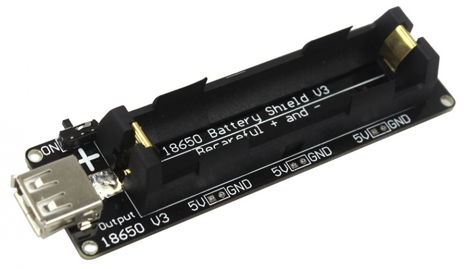 Arduino battery 18650 shield obsługuje 1 akumulator 18650 o dowolnej pojemności. Posiada wbudowaną przetwornicę zmieniającą napięcie do 3V oraz do 5V. Dzięki złączu micro USB można ładować ogniwa kablem USB prosto z portu USB komputera lub ładowarki zakończonej wtykiem micro USB. Moduł posiada gniazdo USB typu A dzięki któremu możemy przerobić układ na power bank. Płytka posiada dodatkowe pola zasilające 3V oraz 5V do których można przylutować goldpiny i wyprowadzić kolejne źródła zasilania.