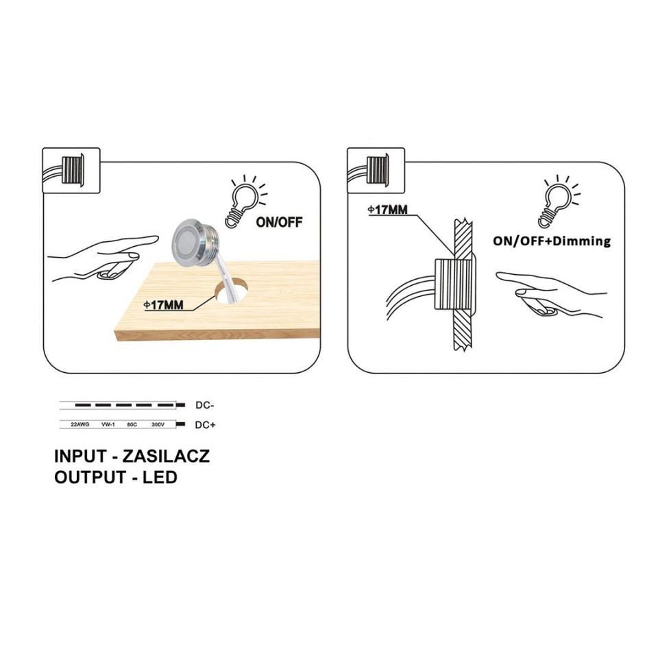 Włącznik dotykowy; ID-0231; ON-OFF; 12-24V DC; 60/100W; 5/4A; czarny; z przewodem 15cm; IP20; fi 17mm; ze ściemniaczem; PROVERO; RoHS; CE