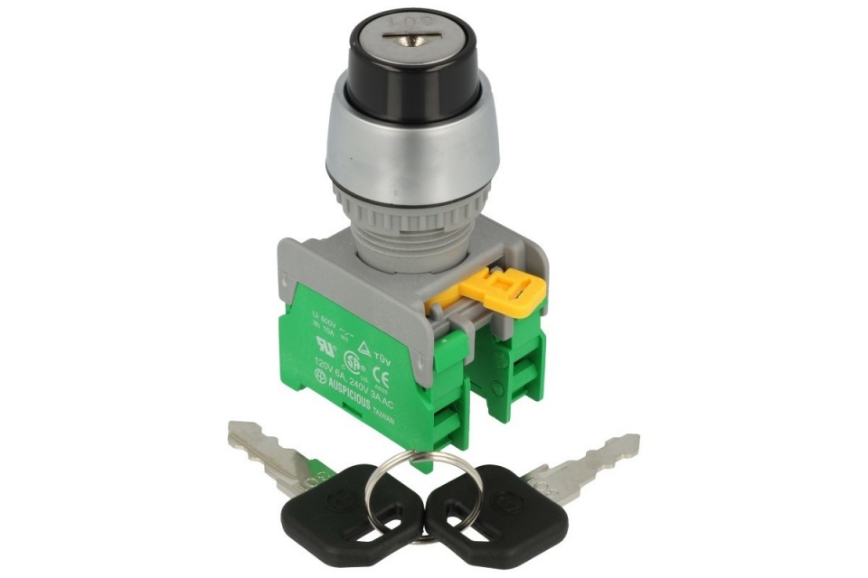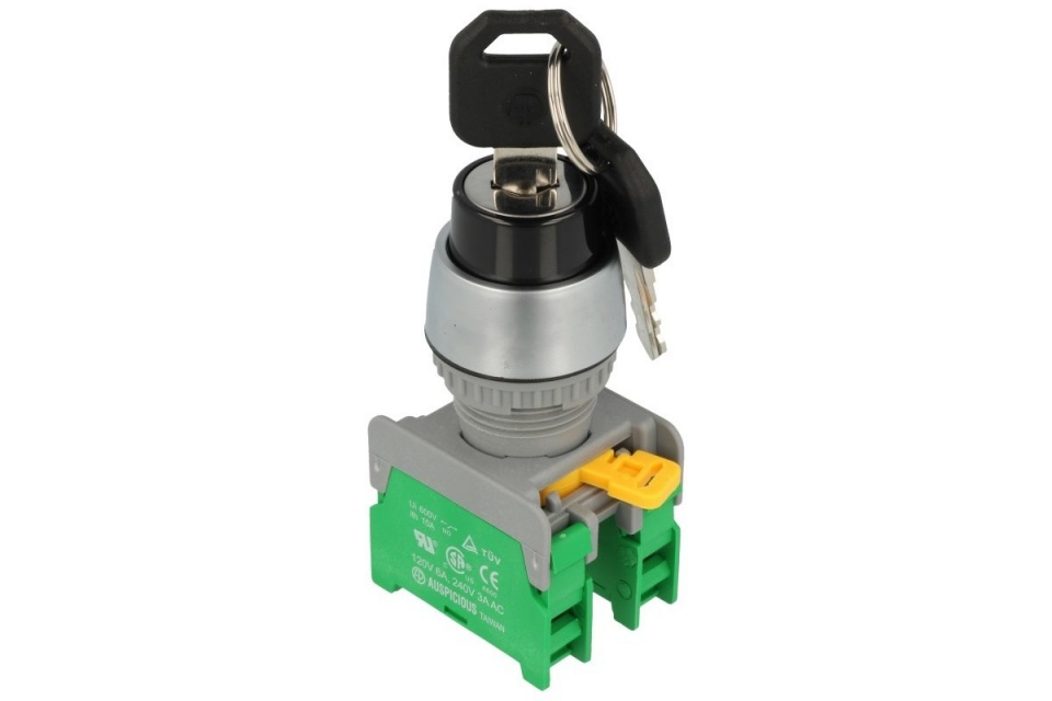 Przełącznik stacyjka; ON-OFF-ON; 2 tory; 45*; 3 pozycje; bistabilny; włącz/wyłącz; na panel; śrubowe; 3A; 230V AC; 22mm; 50mm; plastik; IP65; KS22-2-O; AUSPICIOUS; RoHS
