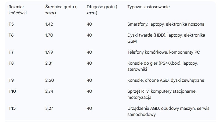 • Kompletny zakres rozmiarów: Od bardzo małego T5 do T15, co pozwala na obsługę większości smartfonów, laptopów, konsol do gier oraz dysków twardych.