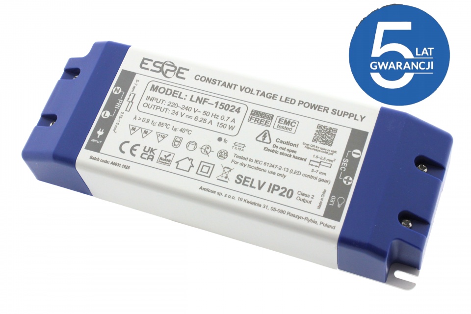 Prezentowany zasilacz LED ESPE LNF-15024 to wysokowydajne źródło napięcia stałego 24 V, zdolne dostarczyć do 6,25 A mocy (150 W). Urządzenie pracuje z napięciem sieciowym 220-240 V AC i jest przeznaczone do zastosowań wewnętrznych w suchych pomieszczeniach (klasa ochrony IP20).Zasilacz posiada zestaw zabezpieczeń: przeciwzwarciowe (SCP), przeciążeniowe (OCP) oraz nadnapięciowe (OVP), co zapewnia bezpieczeństwo pracy systemów LED. Konstrukcja umożliwia integrację w instalacjach oświetleniowych, systemach LED dekoracyjnych, modułach czy aplikacjach przemysłowych wewnętrznych.