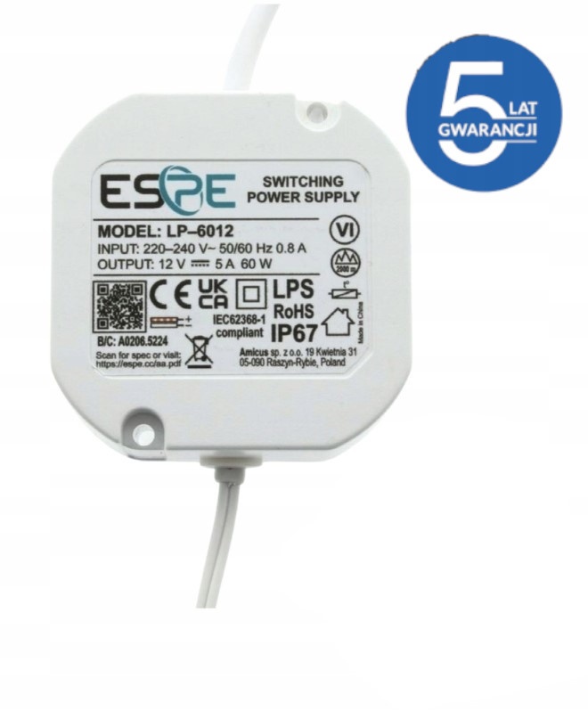 Zasilacz impulsowy; LED do puszki; 60W; 12VDC; 5A; 220-240VAC; 58x58x28,5mm; IP67; dopuszkowy; LP-6012; ESPE; RoHS; CE